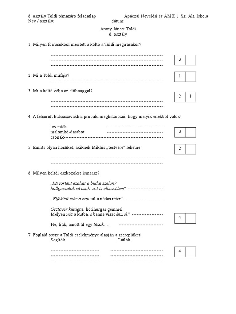 Toldi Feladatlap 6 Osztc3a1ly