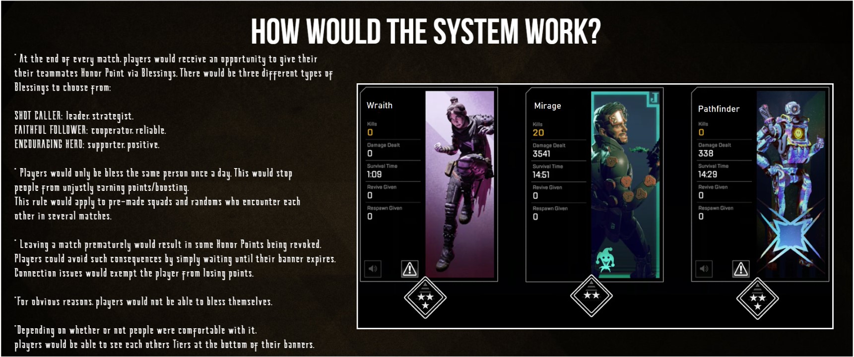 Apex Legends News On Twitter Apexlegends Honor System Idea Would Reward Good Teammates And Prevent Early Leavers Via U Iamcalli How It Would Work Https T Co 8j2bnoshee Https T Co Wdrk7vxm6y